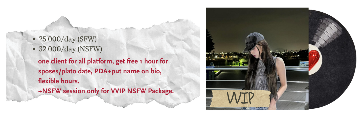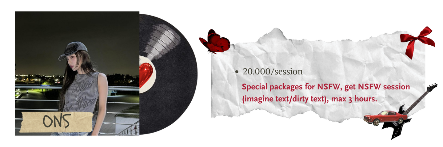 Packages NSFW hanya dibuka untuk ONS, VIP, VVIP saja. Client diwajibkan sudah berumur 21+.